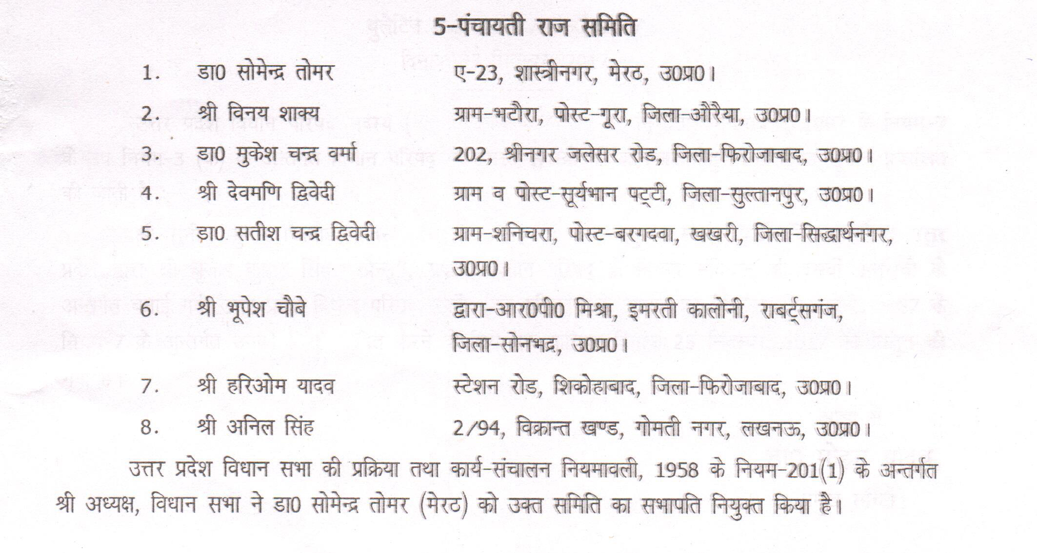 269-(द)समिति का गठन-(1) ग्राम पंचायतों तथा जिला पंचायतों एवं क्षेत्र पंचायतों के सम्बन्ध में ‘भारत सरकार के नियंत्रक-महालेखापरीक्षक की वार्षिक तकनीकी रिपोर्ट’ और ‘मुख्य लेखा-परीक्षा अधिकारी, सहकारी समितियां एवं पंचायतें, उत्तर प्रदेश सरकार की वार्षिक रिपोर्ट’, जो राज्य सरकार द्वारा राज्य विधान मण्डल के समक्ष रखी जायें या उसको निर्दिष्ट की जायें या समिति जिनकी जांच करना आवश्यक समझे, जांच करने के लिए एक पंचायती राज समिति होगी।
